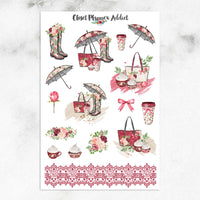 A collection of beautifully illustrated watercolour romance in the rain planner stickers for your planner!