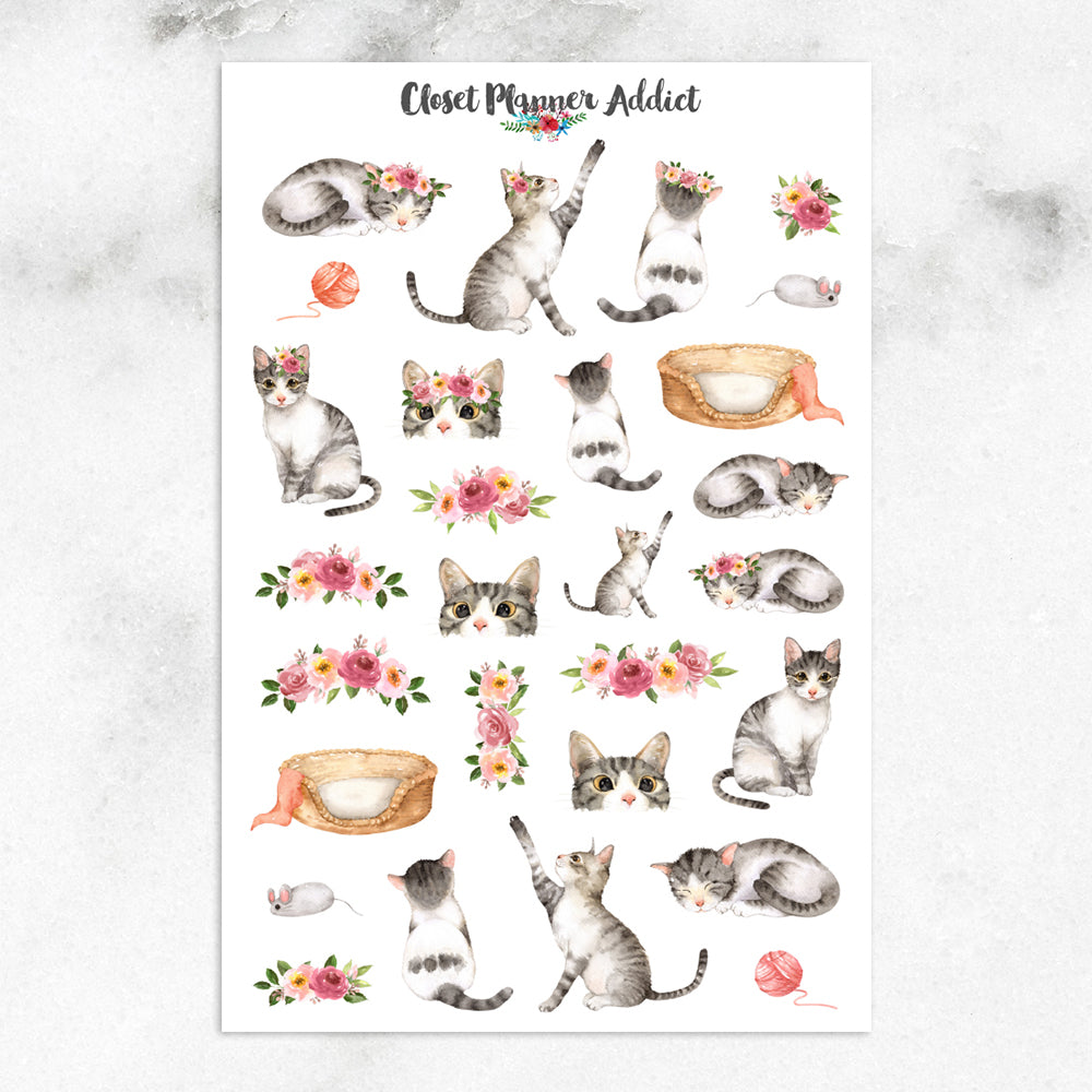 Watercolour Cats and Flowers Planner Stickers (S-334)